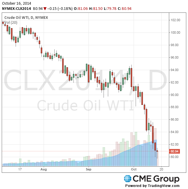 WTI for November delivery fell $1.09, or 1.3 percent, to $80.69 a barrel at 11.03 a.m. on the New York Mercantile Exchange. It earlier touched $79.78, the least since June 29, 2012.
