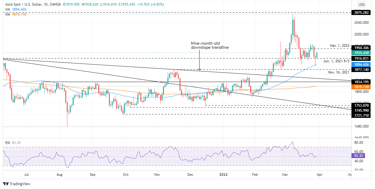 At $1,933.54, the gold price is 0.72% higher on the day with XAU/USD travelling between a low of $1,916.01 and $1,938.62 the high so far. Gold prices rose and have been supported by a softer US dollar and renewed doubts about the possibility of a ceasefire between Russia and Ukraine.