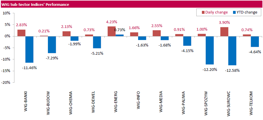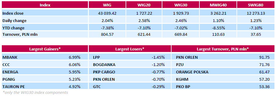 The large-cap stocks' gauge, the WIG30 Index, rose by 2.46%. A majority of the index components recorded advances, with shares of bank MBANK (WSE: MBK; +6.99%), footwear retailer CCC (WSE: CCC; +6.06%) and genco ENERGA (WSE: ENG; +5.95%) leading gains. At the same time, the handful losers included clothing retailer LPP (WSE: LPP; -1.45%), thermal coal miner BOGDANKA (WSE: LWB; -1.2%), railway freight transport operator PKP CARGO (WSE: PKP; -0.77%), oil refiner PKN ORLEN (WSE: PKN; -0.7%) and property developer GTC (WSE: GTC; -0.29%).