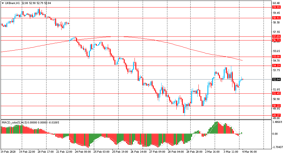 Yesterday, the price of Brent crude declined and closed the day in the red zone near the price of $52.00. Today, the oil was trading in the range of $52.15- $53.15, remaining near yesterday's closing price. On the hourly chart, Brent is still trading below the MA (200) H1 moving average line ($55.05). On the four-hour chart, the situation is similar.