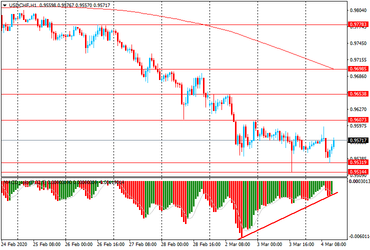 Today, USD/CHF is trading in the range of Chf0.9530-0.9605 after falling yesterday to lows since March 2018 (Chf0.9515). The pair is trading below the moving average MA (200) H1 (Chf0.9700) and on the four- hour chart below MA (200) H4 (Chf0.9725). It is worth noting that the 14-day relative strength index (RSI (14) on D1) is slightly below the 30 level.