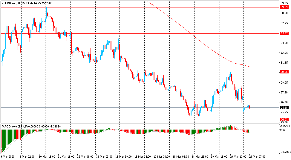 On Friday, the price of Brent crude was trading lower, closing the day in negative territory around $27.00. Today, oil continued to fall to the level of $25.40, remaining near monthly lows. On the hourly chart, Brent is still trading below the MA (200) H1 moving average line ($31.40). On the four-hour chart, the situation is similar.