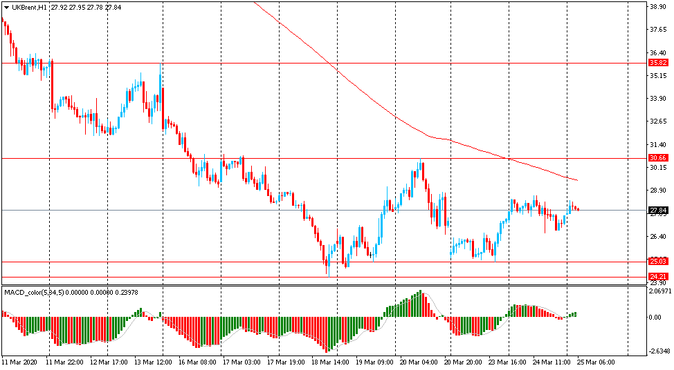 Yesterday, Brent crude traded in the range of $26.60-$28.60, closing the day without significant changes. Today, oil was also in a narrow range of $27.55-30. However, on the hourly chart, Brent is still trading below the MA (200) H1 moving average line ($29.45). On the four-hour chart, the situation is similar.