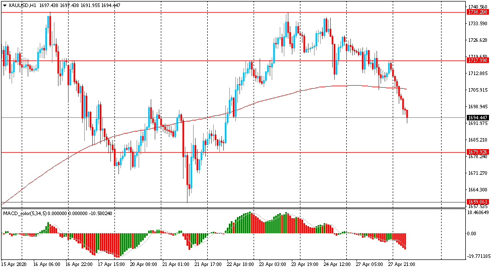 Yesterday, it XAU/USD was trading lower and closed the day in the red zone near the price of $1715. Today, gold also fell slightly, dropping to around $1692. On the hourly chart, XAU/USD is testing support for strength - MA (200) Н1 moving average line ($1706). On the four-hour chart, gold remains above the MA 200 H4 line for now.