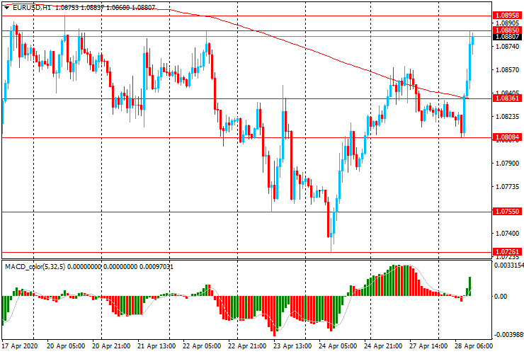 After a slight decline from the beginning of trading to yesterday's low ($1.0810), the EUR/USD rose sharply and reached a high on April 21-22 ($1.0885). On the hourly chart, the pair rose above the moving average MA (200) H1 ($1.0835), but on the four-hour chart, it is trading below MA (200) H4 ($1.0905).