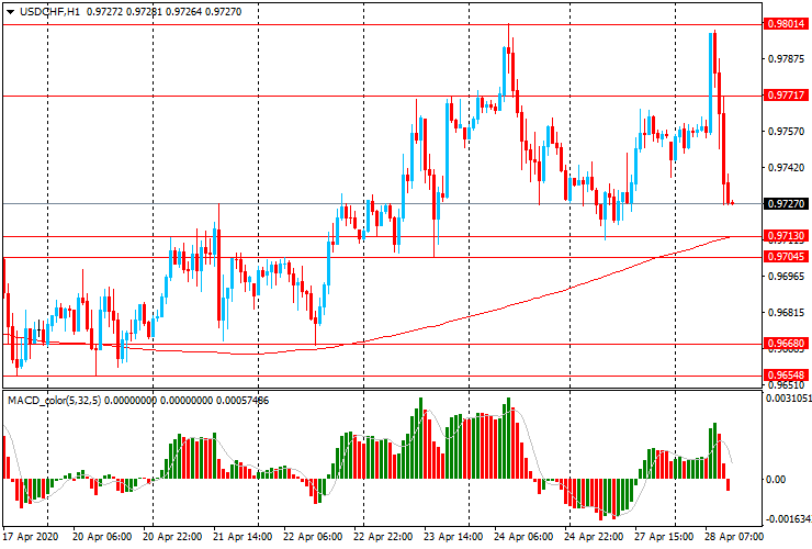 At the beginning of the European session, the USD/CHF pair rose sharply from Chf0. 9750 to Chf0.9800, but soon lost all the gained positions and fell to Chf0.9735. On the hourly chart, the pair is trading above the moving average of MA (200) H1 (Chf0. 9715), and on the four-hour chart above MA (200) H4 (Chf0. 9680).