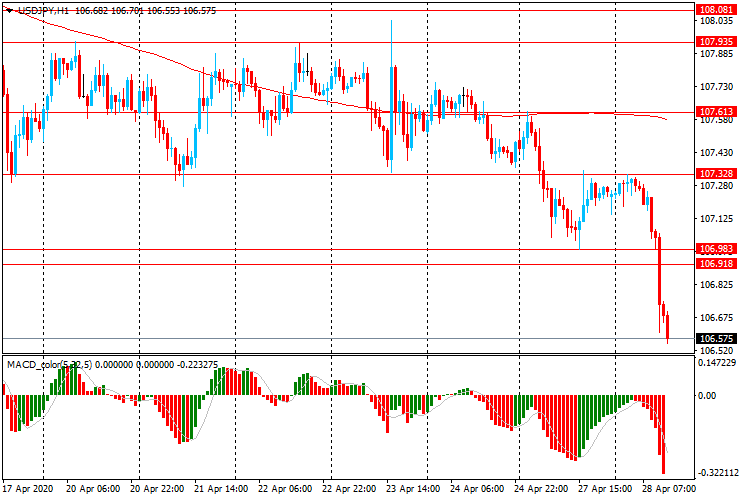Today, the USD/JPY pair is trading with a decline, falling from Y107.30 to a five-week low of Y106.60. On the hourly chart, the pair fell below the moving average of MA (200) H1 (Y107.55), and on the four-hour chart below MA (200) H4 (Y108.20)