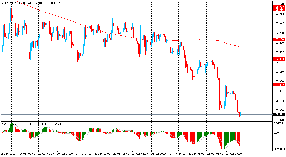 Yesterday, the USD/JPY was trading lower and closed the day in the red zone near the price of Y106.85. Today it also fell, dropping to the level of Y106.50. On the hourly chart, USD/JPY is still trading below the MA (200) H1 moving average line (Y107.50). On the four-hour chart, the situation is similar.