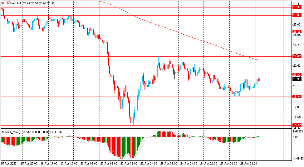 Yesterday, Brent crude traded in different directions in the range of $18.95-$21.00 and closed the day without significant changes. Today, oil rose slightly, rising to around $21.15. On the hourly chart, Brent is still trading below the MA (200) H1 moving average line ($23.00). On the four-hour chart, the situation is similar.