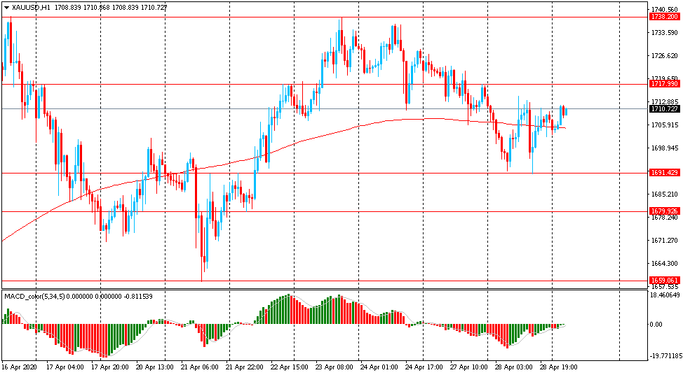 Yesterday, the XAU/USD was trading lower and closed the day in the red zone near the price of $1706. Today, gold traded in a narrow range of $1703-11, remaining near yesterday's closing price. Since yesterday, on the hourly chart, XAU/USD has been testing strength for support - the MA (200) Н1 moving average line ($1705). On the four-hour chart, gold remains above the MA 200 H4 line for now.