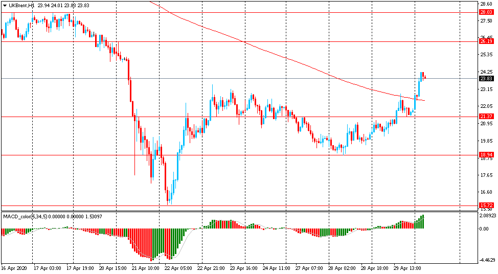 Yesterday, Brent crude was trading higher and closed the day in positive territory near the price of $21.75. Today, oil also rose, rising to $24.20. Since yesterday, on the hourly chart, Brent is testing resistance for strength - MA (200) Н1 moving average line ($22.35). On the four-hour chart, the situation is similar.