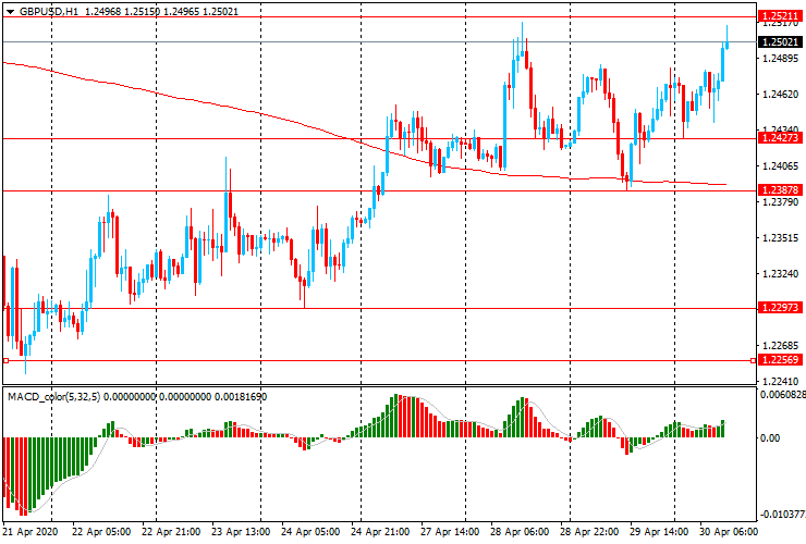 Today, since the beginning of trading, the GBP/USD pair fell slightly from $1.2480 to $1.2430, but during the European session it rose sharply, almost reaching the resistance of $1.2520 (maximum on April 17 and 28). On the hourly chart, the pair rose above the moving average line MA (200) H1 ($1.2395), and on the four-hour chart, it is trading above MA (200) H4 ($1.2255)
