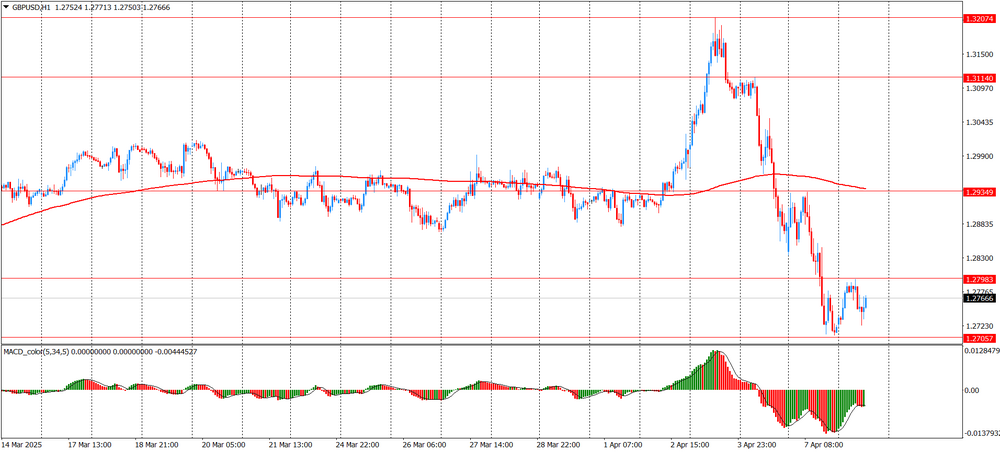 Today, the GBP/USD pair is trading in the range of 1.2725-1.2800, after reaching a monthly low of 1.2705 yesterday. The hourly chart shows a sharp decline after the short-term impulse growth recorded on April 4. The price peaked at 1.315, but then a rapid decline began, as a result of which the pair fell below the key level of 1.2800 and tested the support zone near 1.2705. The MA (200) H1 moving average (1.2935) is well above the current price, indicating a pronounced downward momentum. The MACD indicator remains in the negative zone, despite a slight narrowing of the histogram, which indicates the continuation of bearish pressure, but with signs of temporary weakening. To continue the downward movement, the price must break through the level of 1.2705, which will open the way to the next support. On the other hand, a return above 1.2800 may be the first signal for a more confident upward correction with a target around 1.2935. The overall picture points to the dominance of sellers, with the current pullback being perceived as a technical respite in the downtrend.