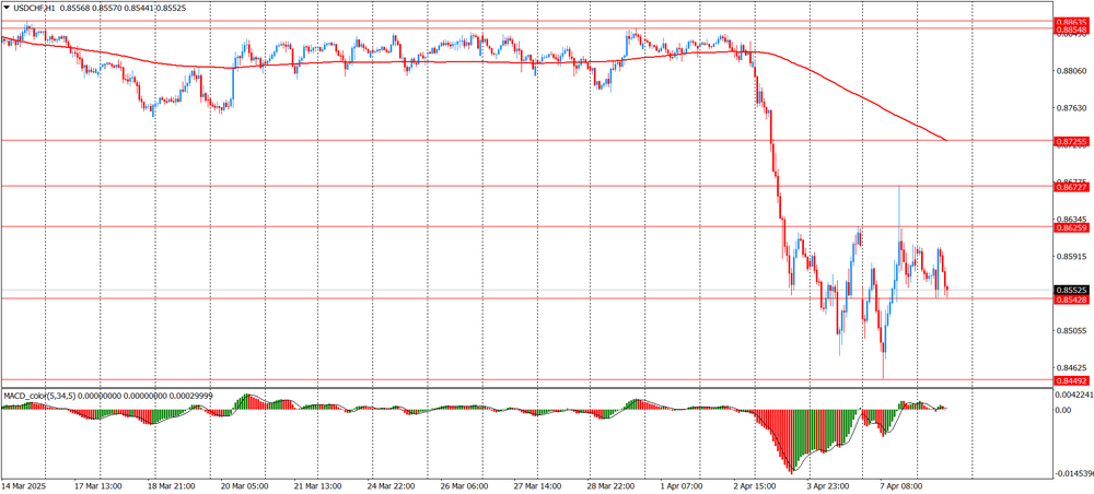 Today, there is a strong downward movement on the hourly chart of the USD/CHF currency pair, which began on April 2, after which the price fell sharply from around 0.8725 and reached a low near 0.8450. There was an upward rebound from this level, but the growth turned out to be limited by the 0.8625 resistance zone, from which the price repeatedly bounced. At the moment, the quotes are fluctuating in the range of 0.8540-0.8605, showing signs of consolidation after a strong fall. The MA (200) H1 moving average (0.8725) is well above the price and is directed downwards, indicating a continuing bearish trend. The MACD indicator shows a weak upward momentum with the histogram moving into a positive zone, but signs of a slowdown may indicate insufficient buyer strength. If the price breaks through the 0.8540 support, it will confirm the market's readiness to resume the downtrend with a target at 0.8450. In case of an upward breakdown of the 0.8625 resistance, the path to 0.8670 will open, but in the current conditions this looks less likely. The overall picture remains bearish, despite local signs of stabilization.