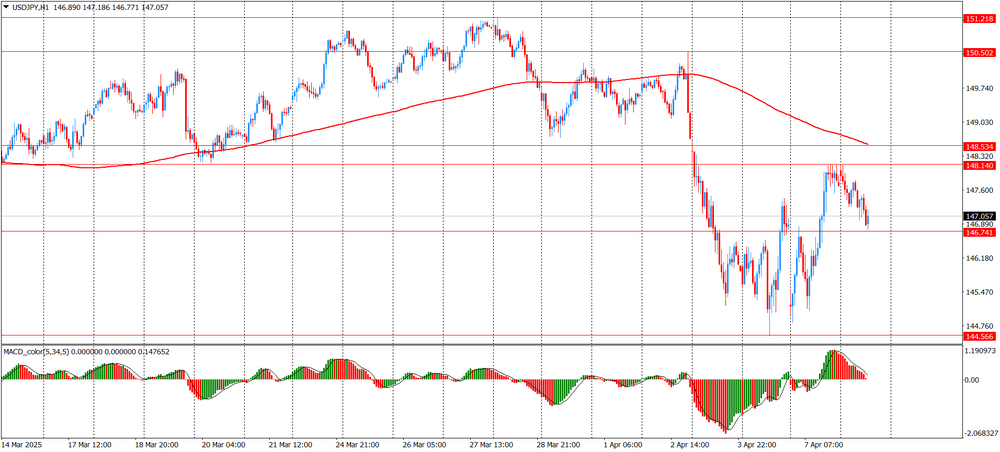 Today, on the hourly chart, the USD/JPY pair is showing a recovery phase after a strong downward momentum that began on April 2. The price pushed off from the support level of 144.55 and reached the zone of 147.600, where it met resistance. There is currently a local downward correction. The MA (200) H1 moving average (148.55) indicates an overall downtrend as the price is below it. This indicates that the bearish sentiment persists over a broader time horizon. The MACD (5,34,5) shows a decrease in the histogram after a recent upward impulse, which may signal the exhaustion of bullish momentum and a possible reversal or deepening of the correction. The zero line has not crossed yet, but the momentum is weakening. The nearest support level is at 146.75, its breakdown may strengthen sales and open the way to 144.55. Resistance is at 148.15 and further at 148.55. Consolidation above these levels may indicate a change in the medium-term trend to an upward one. In the current conditions, the price action near 146.75 will be important - this is a key zone for determining the further direction of movement.