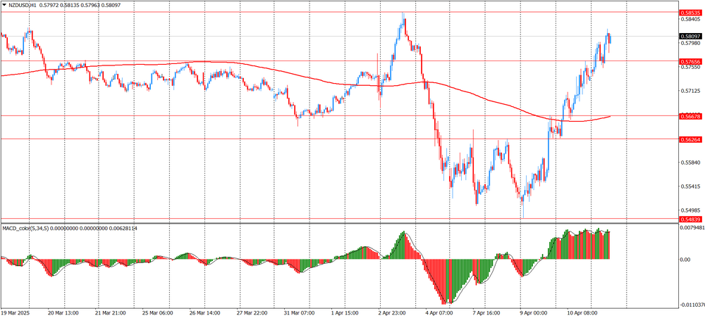 Today, the NZD/USD pair is steadily recovering on the hourly chart after a prolonged period of decline. After testing the support at 0.5485, the quote formed a reversal and began to grow rapidly. The price confidently broke through the levels of 0.5625, as well as the MA (200) H1 moving average (0.5670), which previously indicated a downward trend. At the moment, the price has consolidated above the level of 0.5755 and is approaching the local resistance of 0.5855. The MACD indicator confirms the strength of the upward momentum: the histogram is confidently in the positive zone, showing growth, which signals the dominance of buyers. There is a steady bullish momentum that shows no signs of weakening yet. From a technical point of view, a breakdown of 0.5765 and consolidation above it opens the way to a test of the 0.5855 level. If this resistance is overcome, the upward movement may continue. At the same time, a pullback to the 0.5765 area is possible to test as support, especially given the overbought MACD. As long as the price remains above the moving average and a strong bullish momentum persists, the priority remains on the buyers' side.