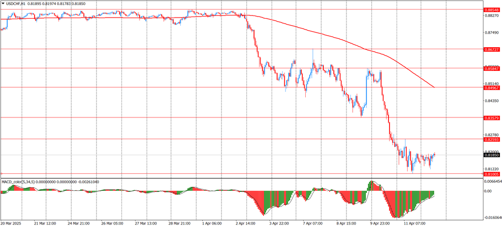 There is a steady downward trend on the USD/CHF hourly chart today. The price was steadily moving downwards, breaking through important support levels - 0.8585, 0.8495, 0.8360 and 0.8260. At the moment, the pair is consolidating around 0.8185 after a recent sharp drop to the lowest value since 2022, 0.8100. The price is well below the MA (200) H1 moving average (0.8495), which is pointing downwards, confirming the predominance of bearish sentiment. The MACD indicator also shows signs of the downward momentum fading: the histogram is shrinking, but remains in the negative zone, which may indicate a possible short-term correction or lateral consolidation. The overall picture remains bearish as long as the price is trading below the 0.8360–0.8495 zone.