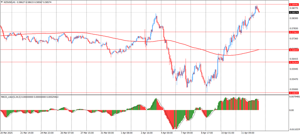Today, the NZD/USD pair has a steady upward momentum on the hourly chart. The price broke through and confidently consolidated the MA (200) H1 moving average (0.5685), which signals a change in the medium-term trend from a downward to an upward one. After a long flat and decline in the area of late March and early April, the quotes turned up from the support of 0.5485 and began to form a series of rising lows and highs. The last impulse allowed the price to overcome the key resistance levels at 0.5625 and 0.5685, and then 0.5765, which can now act as a support level with a possible correction. The current price is approaching the 4-month high of 0.5895. There is some consolidation and a slowdown in growth in this zone, which may indicate the formation of a local overbought. The MACD indicator remains in the positive zone, which confirms the presence of bullish momentum. However, the histogram has begun to narrow, which may signal a decrease in the growth rate and the approach of a corrective pullback.