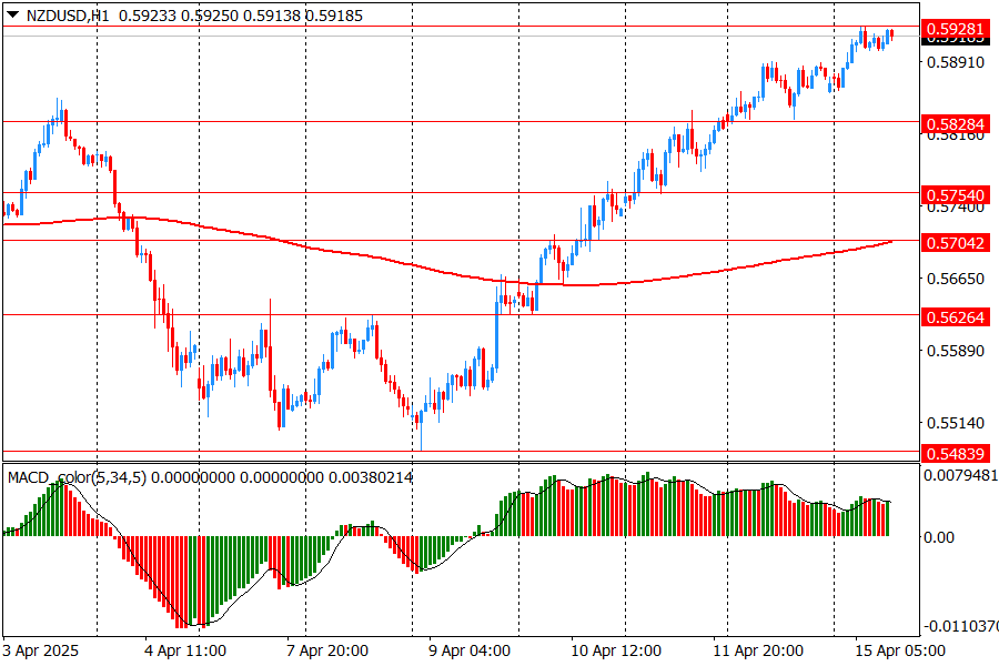Today, the NZD/USD pair has a steady upward momentum on the hourly chart. The price has firmly consolidated above the MA (200) H1 moving average (0.5705), which signals a change in the medium-term trend from downward to upward. After a long flat and decline in the area of late March and early April, the quotes turned up from the support of 0.5485 and began to form a series of rising lows and highs. The current price is approaching the 4-month high of 0.5930. There is some consolidation and a slowdown in growth in this zone, which may indicate the formation of a local overbought. The MACD indicator remains in the positive zone, which confirms the presence of bullish momentum. However, the histogram has begun to narrow, which may signal a decrease in the growth rate and the approach of a corrective pullback. As long as the price remains above MA (200) H1 and the upward structure remains, the priority remains on the buyers' side.