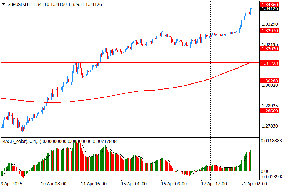 Today, on the hourly chart, GBP/USD continues its steady upward movement, reaching a 6-month high. The pair overcame the resistance of 1.3300 and approached the level of 1.3435, which now acts as the nearest benchmark for a breakdown. The trend is clearly bullish, which is confirmed by a steady breakaway of quotes from the MA (200) H1 moving average (1.3130), which also demonstrates a steady upward trend. The growth is accompanied by high activity of buyers and consistent updates of local highs. The MACD indicator signals an increase in bullish momentum: the histogram continues to grow in the positive zone, and the green bars confirm a steady acceleration.