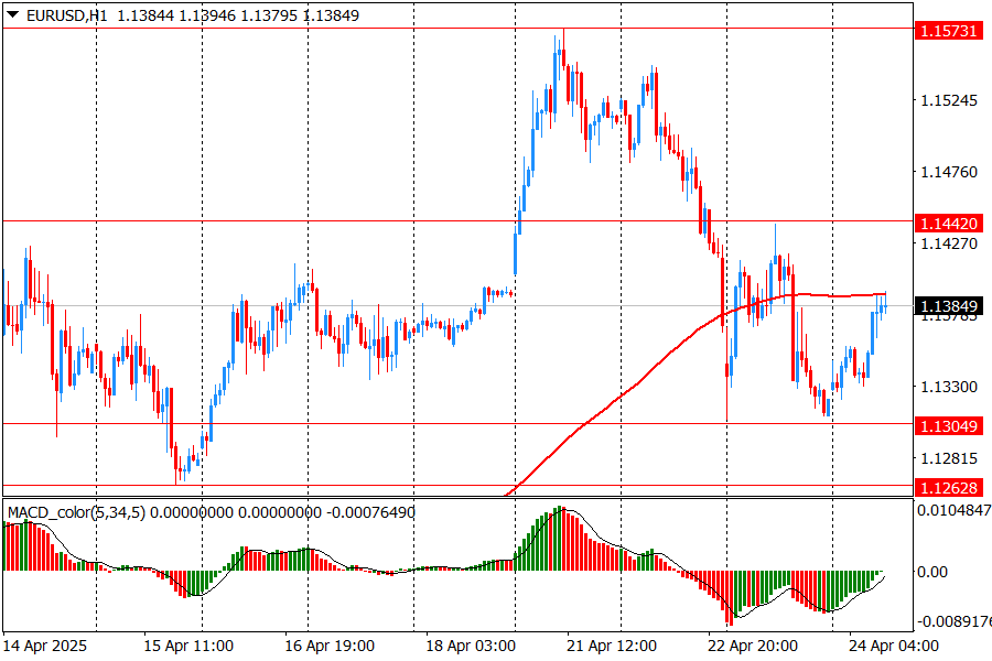 Today, the hourly chart of EUR/USD shows a recovery after a strong downward movement. After reaching a local low around 1.1305, the price bounced up and is currently trading near 1.1385, trying to overcome the MA (200) H1 moving average, which is now acting as resistance. The MACD histogram began to show a recovery: the histogram moved into a positive zone, indicating a weakening of the downward momentum and the possible beginning of an upward correction. In the short term, there is a potential formation of a "double bottom", which may indicate an upward trend reversal, especially if the price manages to gain a foothold above MA (200) H1 and break through the resistance of 1.1440. However, if the breakdown is rejected and returns below 1.1305, the bearish scenario will strengthen with a possible test of 1.1260.