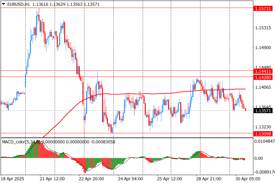 Today, the hourly chart of EUR/USD shows consolidation in the range of 1.1310-1.1440 after declining from peaks on April 18-21. The MA (200) H1 moving average (1.1400) acts as a dynamic resistance, which indicates the predominance of downward pressure in the short term. As long as the price is below this average, the chances of a continuation of the downward movement remain.