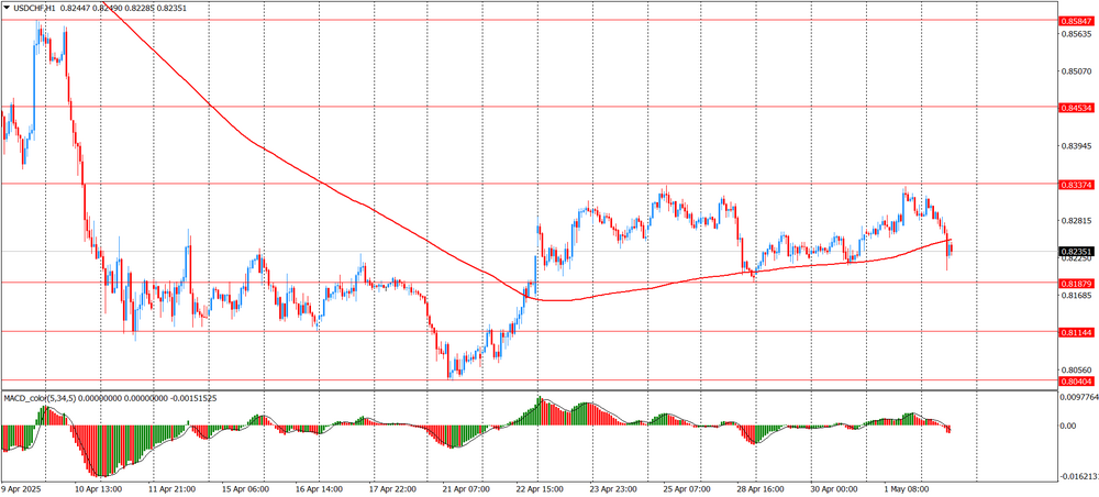 Today, the USD/CHF hourly chart shows an attempt to reverse the upward correction formed after a long downward trend in the first half of April. After reaching a local maximum around 0.8340, the price began to decline and has currently broken through the moving average of MA (200) H1 downwards, which is an alarming signal for the bulls. The breakdown was accompanied by a sharp downward momentum, which may indicate increased selling pressure. The MACD indicator confirms the decline, as the histogram has dropped below zero and reinforces the negative dynamics. The overall technical picture is shifting towards a bearish scenario, especially if the price continues to stay below MA (200) H1 and consolidates below the current support levels.