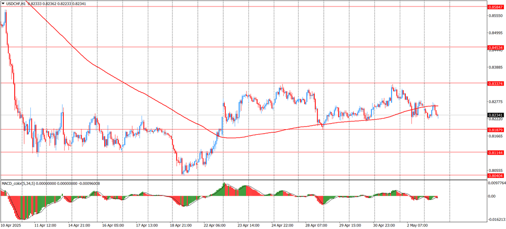 Today, the USD/CHF hourly chart shows a recovery after a sharp downward momentum in early April, but the overall movement remains in a sideways range. The pair is trying to gain a foothold above the 0.8190 support level, but is encountering resistance in the 0.8340 area, where reversals have already occurred. The MA (200) H1 moving average runs almost through the center of the range and is now acting as a dynamic resistance. The price has repeatedly tested it from above and below, which indicates the absence of a confident trend. The MACD indicator shows neutral signals with a slight negative divergence, indicating a weakening of the bullish momentum. The overall picture looks restrained and bearish, especially if consolidation occurs below the moving average and the 0.8190 level.