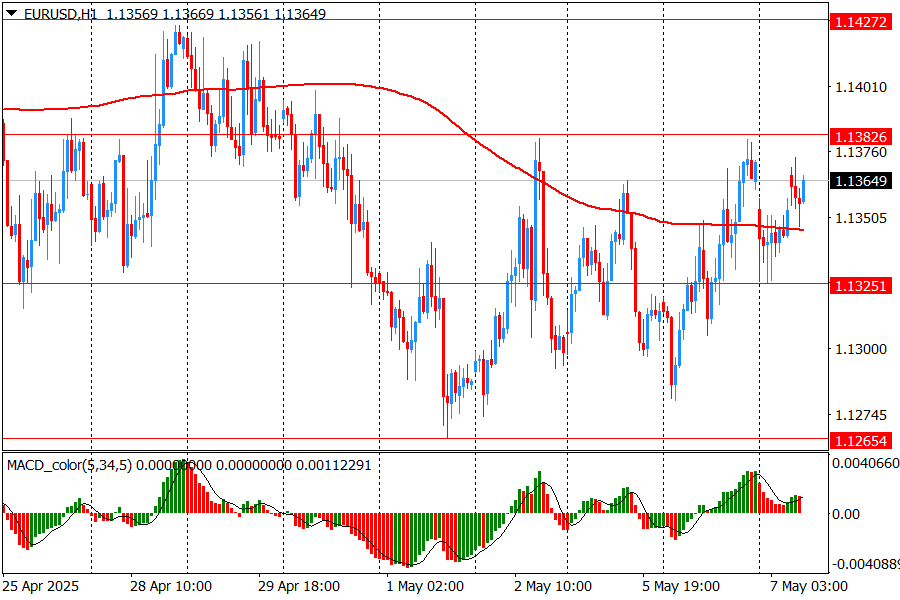 The hourly chart of EUR/USD shows a recovery after the downward trend that formed from the end of April to the beginning of May. In recent sessions, the price has been able to gain a foothold above the 1.1325 support level and is approaching resistance around 1.1380, which indicates growing bullish activity. The current quote is near 1.1365, slightly above the MA (200) H1 moving average, which confirms a short-term reversal in favor of buyers. The MACD indicator shows positive values, while the histogram is growing, which indicates a continuing upward momentum. However, the signal line remains close to the zero level, which may indicate the approach of the overbought zone and a potential correction near the resistance of 1.1380. If EUR/USD can break through and stay above 1.1380, this will confirm the strength of the current upward movement with a possible test of the 1.1430-40 zone. Otherwise, we can expect a pullback to 1.1325, where the bulls may be active again.