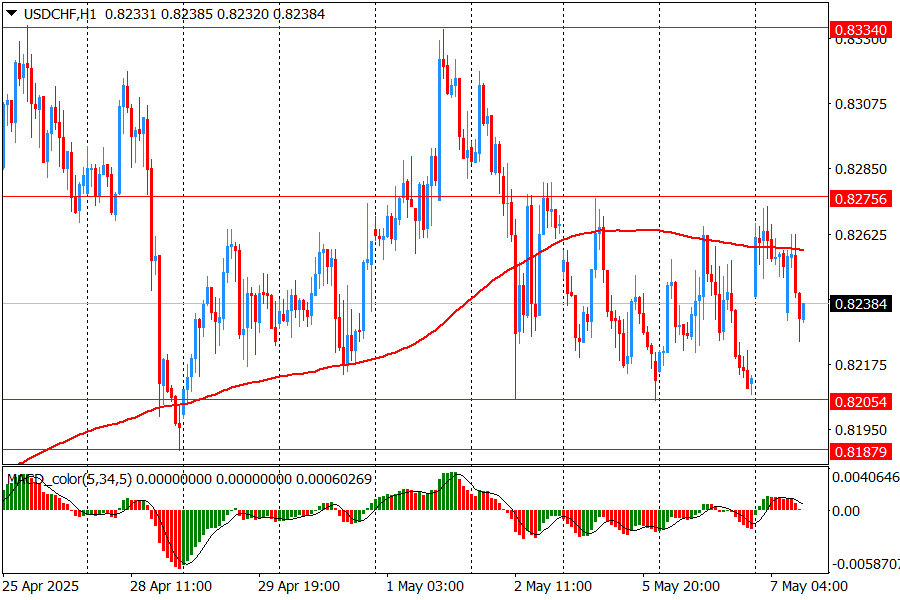 Today, a downward movement is observed on the hourly chart of USD/CHF after reaching a local maximum in the area of 0.8335. After that, the price declined and fluctuates within a sideways range with boundaries of approximately 0.8275 and 0.8205. Within the range, the asset is trading in a narrowing corridor, indicating consolidation and possible preparation for a stronger movement. The MA (200) H1 moving average is directed downwards, which confirms the dominance of the bearish mood. The price is trading below this average, which additionally indicates the sellers' advantage. The MACD indicator with parameters shows weak activity, the histogram fluctuates near the zero line without a clearly marked divergence, which indicates a decrease in volatility and uncertainty among market participants. The overall picture indicates a consolidation phase within a downtrend, with an increased probability of continued decline in the event of a breakdown of the current support. You should carefully monitor the volume and confirmation of movement.