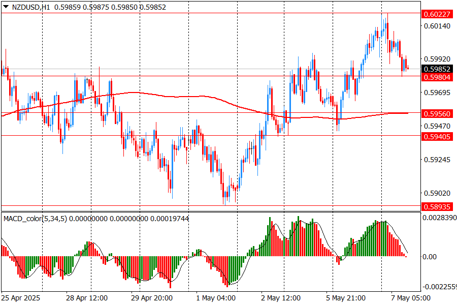 Today, the hourly chart of NZD/USD shows the development of an upward correction after the previous downward trend. The price rebounded from the local low around 0.5895 and rose steadily, breaking through the resistance levels of 0.5940, as well as the moving average, which now acts as support. The moving average shows signs of an upward reversal, which confirms the shift of the short-term trend towards the bulls. Consolidation above it indicates a change in market expectations in favor of further growth. The nearest resistance level is the 0.6020 zone, the breakdown of which may lead to an acceleration of the upward momentum. The MACD indicator with parameters shows a gradual weakening of the bullish momentum: the histogram decreases after the recent peak, but remains in the positive zone for now. This indicates a possible short-term correction or a consolidation phase before a new move.