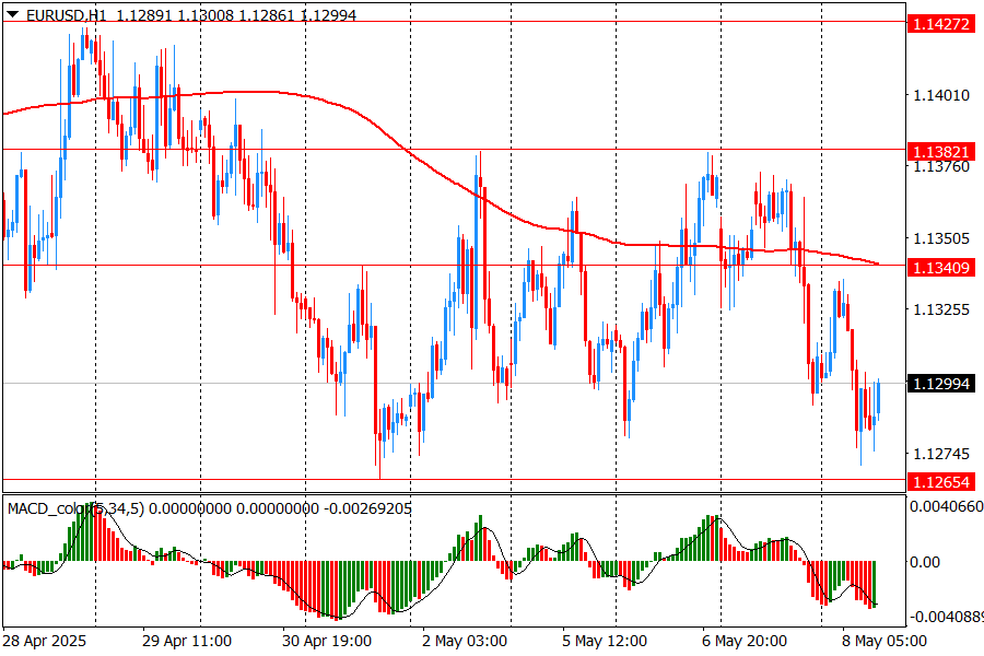 There is a downward trend on the hourly chart of EUR/USD. The price is trading below the MA (200) H1 moving average (1.1340), which confirms the presence of bearish pressure. After growth attempts on May 6-7, the price failed to gain a foothold above the resistance level of 1.1340 and began to decline. The quote is currently in the area of 1.1300, approaching the support of 1.1265. The MACD indicator shows a bearish divergence — the histogram goes into the negative zone, confirming the strengthening of the downward momentum. The 1.1380 and 1.1430 levels act as key resistances, while support remains at 1.1265. In the short term, there is a high probability of testing this support, and if it is breached, the way opens for a deeper decline. In case of a reversal above 1.1340, a return to 1.1380 is possible.