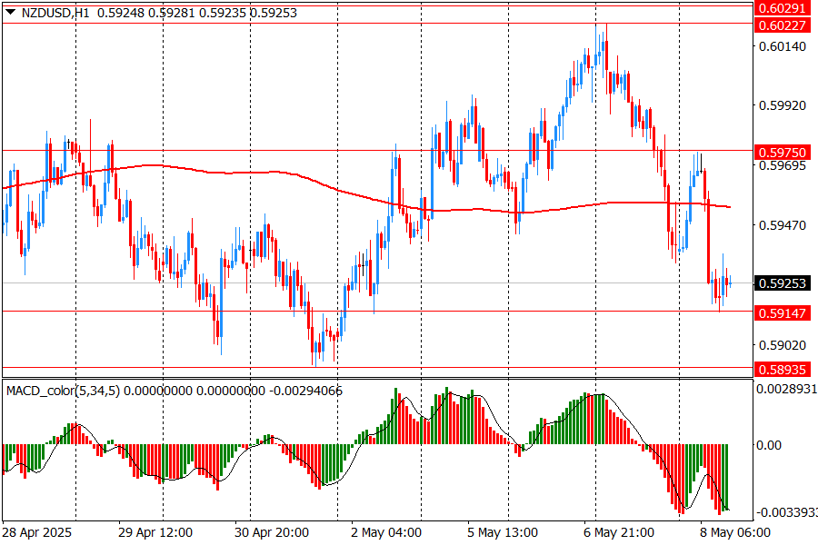 There is a moderate downward movement on the NZD/USD hourly chart today. The price rebounded from the local high around 0.5975 and rose steadily, breaking through the resistance levels of 0.5940, as well as the moving average, which now acts as support. The moving average shows signs of a downward reversal, which confirms the shift of the short-term trend towards the bears. Consolidation below indicates a change in market expectations in favor of further growth. The MACD indicator shows a gradual weakening of the bullish momentum: the histogram decreases after the recent peak, but remains in the positive zone for now. This indicates a possible short-term correction or a consolidation phase before a new move.