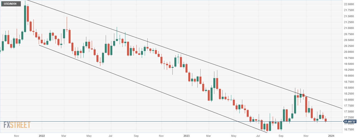 El USD/MXN encontró un fuerte soporte en el mínimo de tres meses situado en 17.02 el martes 19 y el miércoles 20 de diciembre. Este jueves, el par comenzó la jornada elevándose a un máximo diario en 17.15 pero tras los datos de México y EE.UU. ha caído a 17.04, nuevo suelo del día.