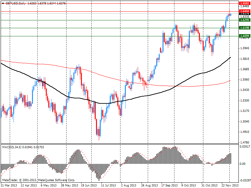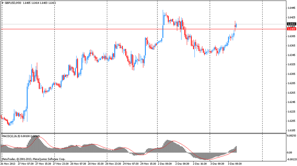 La libra subió por encima de 1,6400 dólares, el máximo de la sesión después de la publicación de datos positivos sobre el índice de la actividad empresarial en el sector de la construcción del Reino Unido. El índice de noviembre se situó en 62,6, mientras que el valor anterior y las expectativas de los analistas estaban cerca de 59,3-59,4. Así, los datos superaron las estimaciones de los expertos, que apuntan al crecimiento económico en el sector de la construcción.
