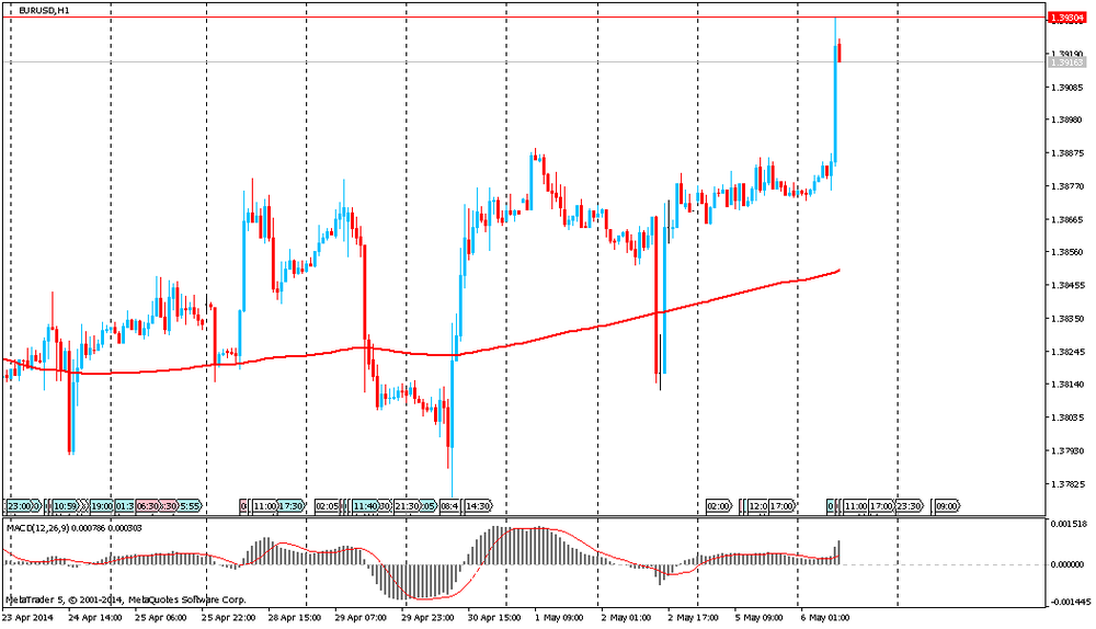 El euro aumento actualizando el maximo de la sesión, llegando a 1,3930 dólares por la publicación del índice de la actividad empresarial en el sector de servicios de los países de la eurozona positivo. Se supo que el sector de los servicios PMI en Italia en abril subió a 51,1, por encima de las expectativas de 50,4. En España, la cifra fue de 56,5, por encima de las expectativas de 54,4. Francia - 50,4, superior a lo esperado 50.3. En Alemania - índice PMI subió a 54,7, frente a una previsión anterior valores 53- 55. En general, en la Zona del Euro, la actividad en el sector servicios Markit coincidió con la previsión de 53,1.