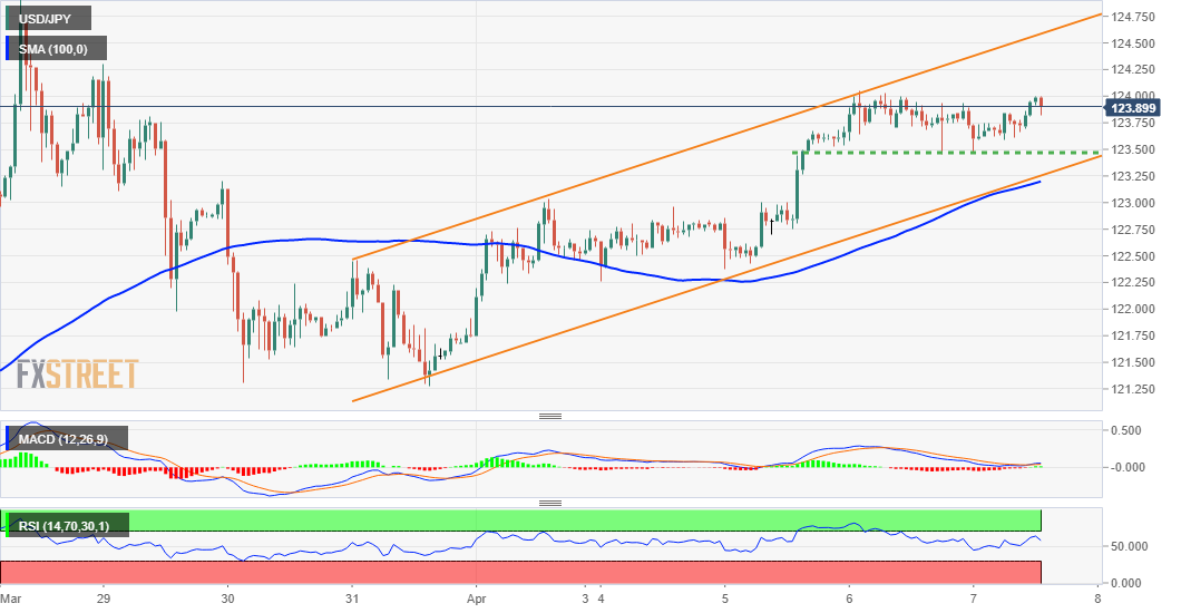 El par USD/JPY atrajo algunas compras en las caidas cerca de la región de 123.45 el jueves y subió a un nuevo máximo diario durante los inicios de las sesión americana. Los toros, sin embargo, tuvieron problemas para capitalizar el movimiento y ahora parecen esperar una fuerza sostenida más allá de la marca redonda de 124.00.