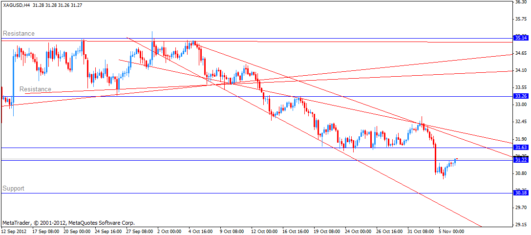 En este momento la plata sube de nuevo. Si las caídas de los precios de plata siguen pronunciandose , un posible objetivo será el soporte de los 30,18 o la línea de apoyo a las 29,38 aproximadamente. Si el precio de la plata sube, un posible objetivo será la línea de resistencia en alrededor de 32,05.