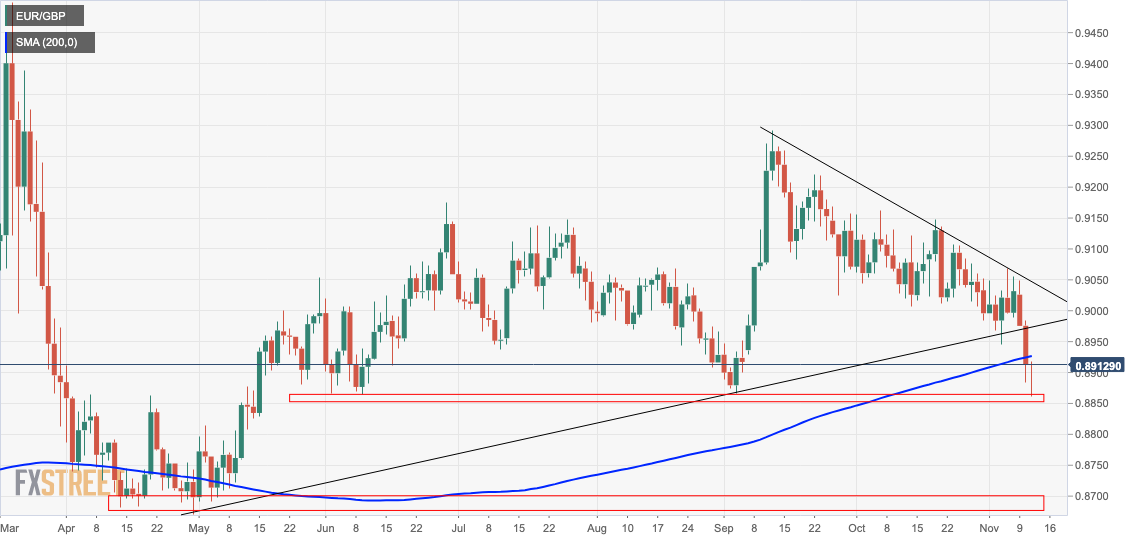 El EUR/GBP aceleró su tendencia bajista el martes confirmando la ruptura del soporte de la línea de tendencia desde finales de abril con la recuperación de la libra. Las noticias sobre los prometedores resultados de la vacuna contra el coronavirus de Pfizer y las especulaciones del mercado sobre un inminente acuerdo de Brexit impulsaron la demanda de la libra.