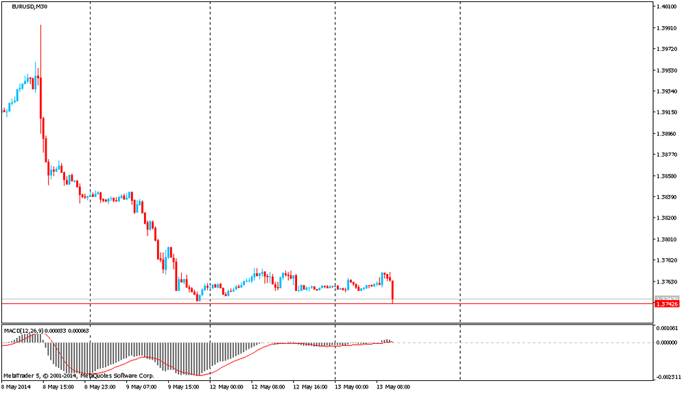 El euro cayó a 1,3742 dólares, actualizando el mínimo de la sesión tras la publicación de los datos negativos sobre el índice de la confianza en el entorno empresarial del instituto ZEW en Alemania y la zona del euro. El valor del índice de mayo en Alemania cayó hasta el nivel de 33,1, mientras que el valor anterior y las expectativas de los analistas estaban en 41,3-43,2, respectivamente.