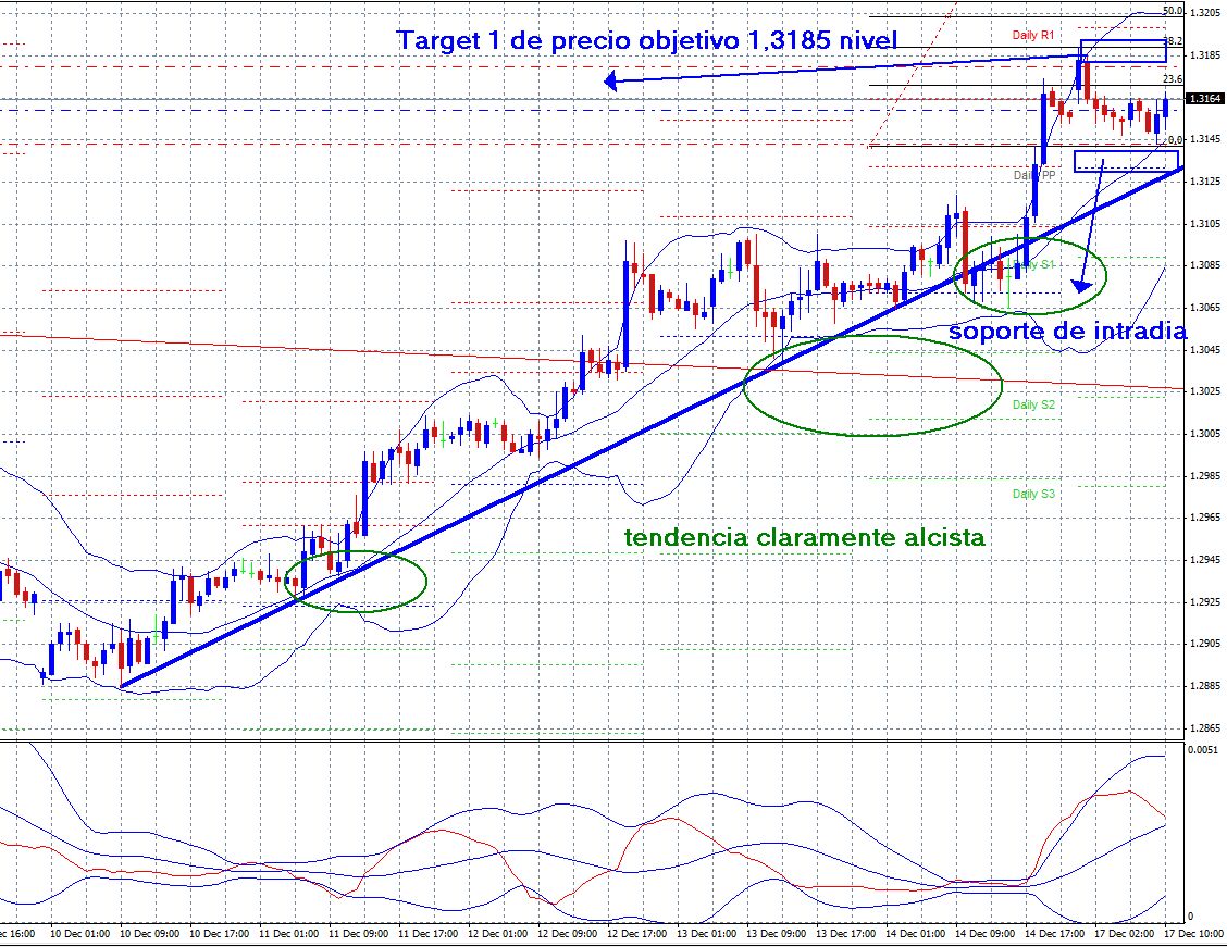 El par en tendencia claramente alcista tras la jornada precedente del viernes donde conocimos unos buenos datos en EEUU casi al final de la sesión, en lo que llevamos de sesión, durante toda la sesión asiática rango de consolidación alcista lateral, subida hasta la resistencia de 1,3185, apoyo posterior en la apertura de Europa, de nuevo con proyección " alcista"