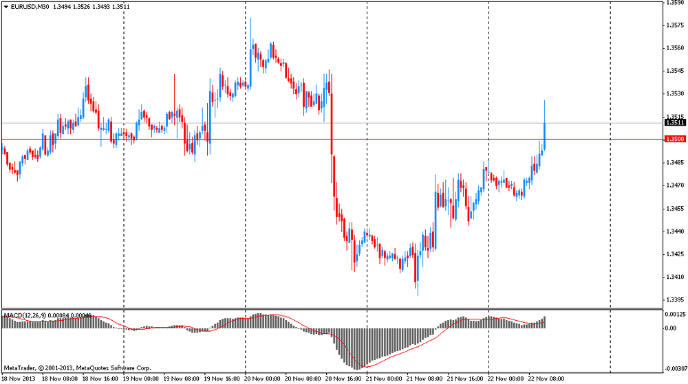 El euro subió por encima de 1,3500 dólares, actualizando el máximo de la sesión después de la publicación de los datos positivos sobre el índice de clima empresarial alemán del Instituto IFO. La cifra de noviembre fue de 109,3, mientras que los analistas esperaban un crecimiento total de 107.9. Así, los datos superaron las estimaciones de los expertos, dado el creciente optimismo en la economía más grande de Europa.