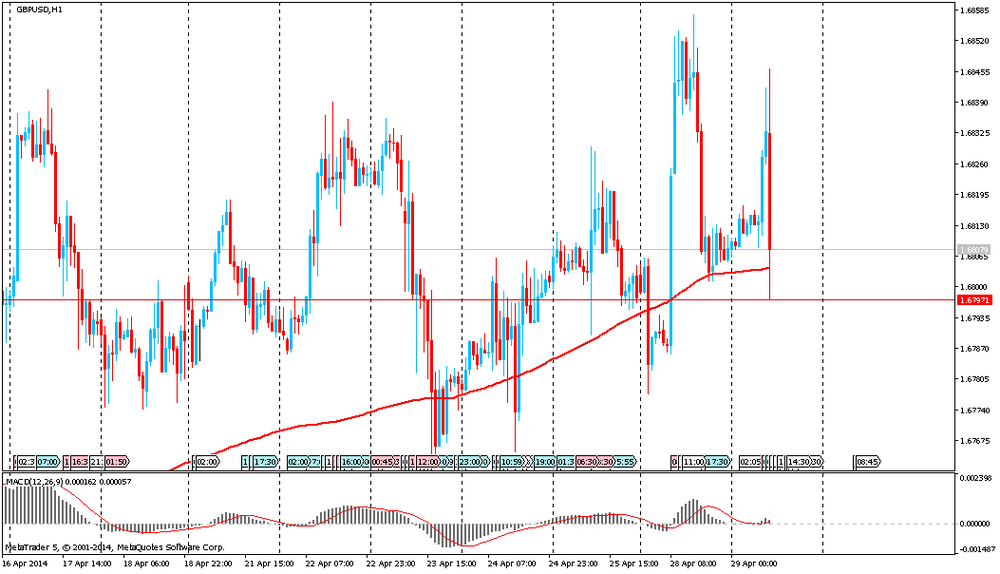 La libra subió a $ 1.6842, actualizando el máximo de las sesiones a la espera de los datos positivos sobre el PIB del Reino Unido. De acuerdo con el pronóstico promedio de los economistas, el producto interno bruto en el primer trimestre es probable que crezca un 0,9% en comparación con el período anterior de tres meses. Si se confirma la previsión - será la cifra de aceleración más rápida desde el segundo trimestre de 2010. Los datos del PIB para el 1er trimestre son muy importantes, ya que pueden demostrar que el crecimiento de la economía británica es el más rápido entre los países del G7.