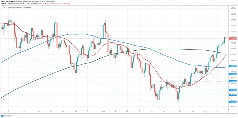 El precio del oro superó la marca de $1900 la onza este miércoles, registrando su valor intradiario más alto desde enero, dado que el metal dorado ha estado beneficiándose de mayores perspectivas inflacionarias en Estados Unidos y de la caída de los rendimientos de los bonos del Tesoro.