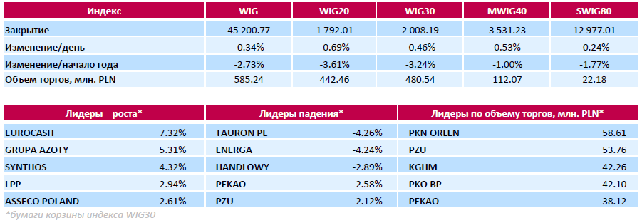 Индекс компаний большой капитализации WIG30 снизился на 0. 46%. В лидерах падения среди бумаг индексной корзины WIG30 оказались акции энергогенерирующих компаний TAURON PE (WSE: TPE) и ENERGA (WSE: ENG), обвалившиеся на 4.26% и 4.24% соответственно. Также в число главных аутсайдеров попали акции учреждений финансового сектора - банков HANDLOWY (WSE: BHW) и PEKAO (WSE: PEO), а также страховой компании PZU (WSE: PZU), которые подешевели на 2.89%, 2.58% и 2.12% соответственно. Напротив, наибольший рост показали акции FMCG ритейлера EUROCASH (WSE: EUR), взлетевшие на 7.32% после падения в течение двух сессий подряд. За ними следуют бумаги химпредприятий GRUPA AZOTY (WSE: ATT) и SYNTHOS (WSE: SNS), котировки которых подскочили на 5.31% и 4.32% соответственно.