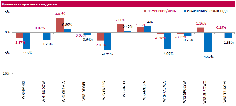 Во вторник польский рынок акций закрылся снижением. Индекс широкого рынка WIG потерял 0.34%. В отраслевом разрезе сектора индекса WIG показали смешанную динамику. Более всего подорожали бумаги компаний химической промышленности (+3.57%), тогда как наибольший отрицательный результат зафиксировали акции энергогенерирующих компаний (-2.01%).