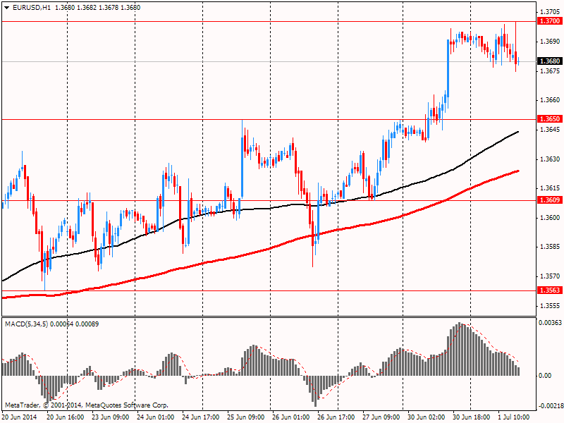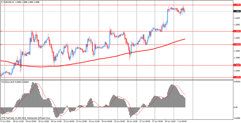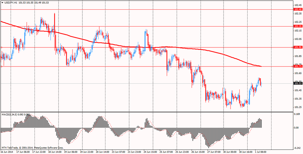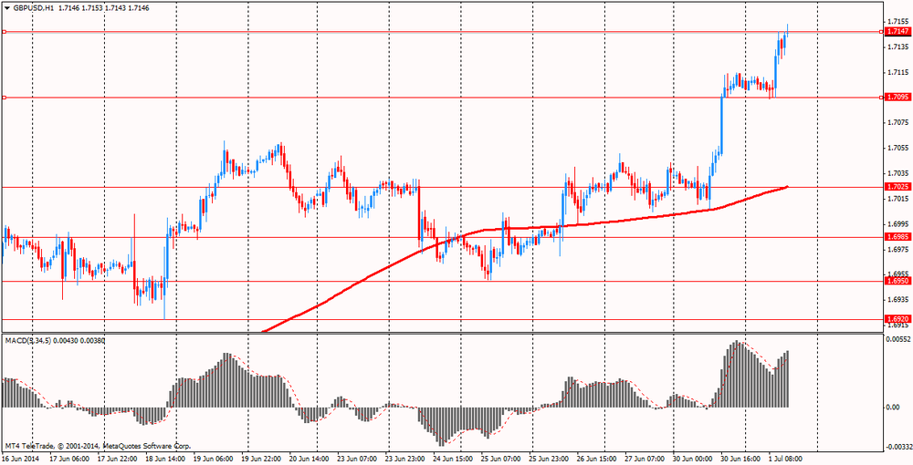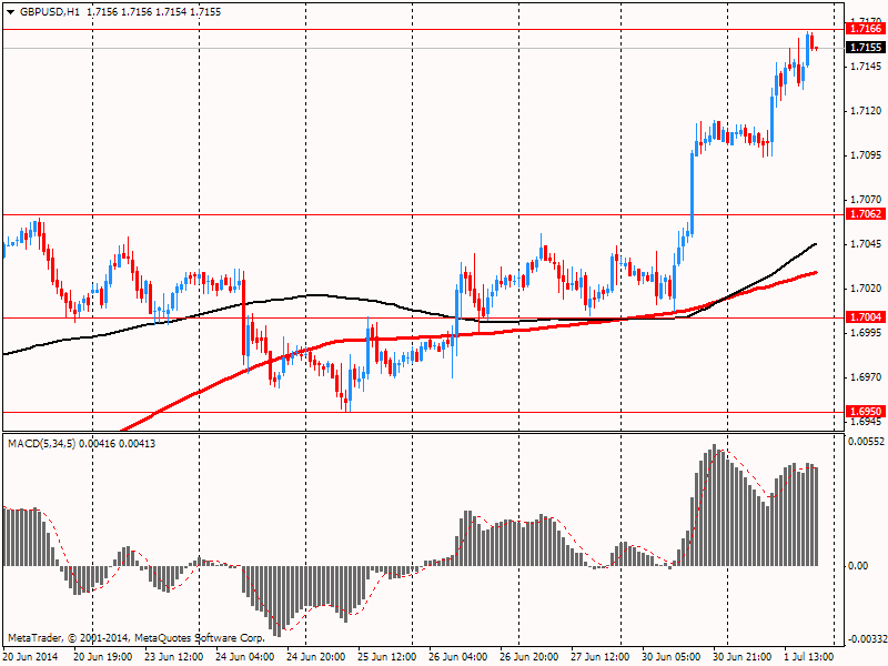 Курс фунта вырос против доллара, достигнув при этом максимальных значений с 21 октября 2008 года. Поддержку валюте оказал отчет, выявивший, что производственный PMI Великобритании вырос до 57,5 в прошлом месяце после 57,0 в мае. Аналитики ожидали, снижения индекса до 56,8. Доклад также сообщил: экономика Великобритании продолжает расти во втором квартале высокими темпами, усиливая надежды, что продолжение восстановления подтолкнет Банк Англии к повышению процентных ставок. Безработица в Великобритании находится на самом низком уровне за пять лет, цены на жилье активно растут, а экономика в целом в этом году, как ожидается, покажет лучший подъем среди стран G7. На этом фоне инвесторы ожидают первого повышения базовой процентной ставки Банком Англии за посткризисный период к февралю 2015 года.