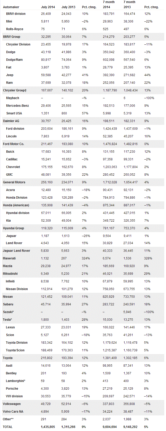 Что касается продаж новых автомобилей, то они увеличились на 9 процентов - до 1,435 млн, что оказалось немного меньше прогнозов (+10 процентов). Последнее улучшение было вызвано 20-процентным ростом продаж корпорацией Toyota Motor и 10-процентным увеличением со стороны Nissan Motor и Ford Motor Co Chrysler Group.