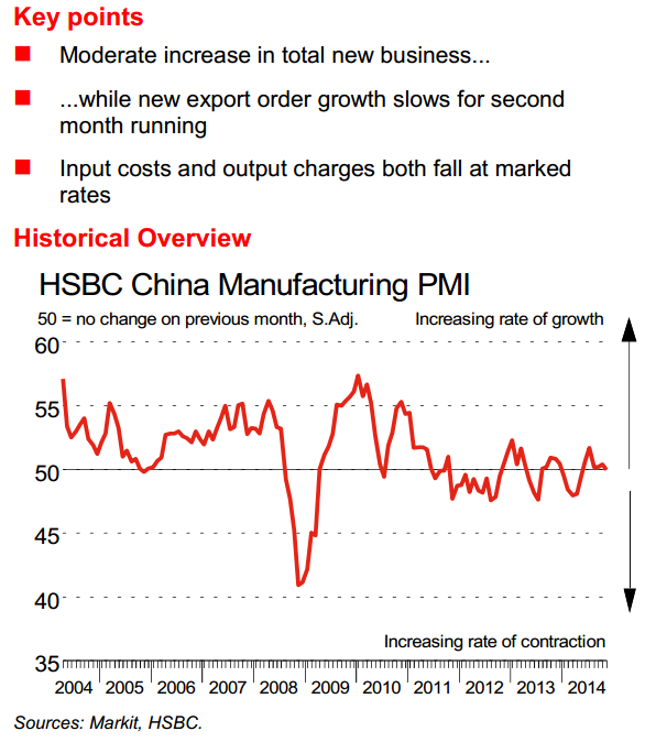 Показатель индекса деловой активности Китая в производственном секторе HSBC в ноябре снизился от 50.4 до 50. Индекс деловой активности (PMI) HSBC в сфере обрабатывающей промышленности, публикуемый Markit Economics, - это опережающий индикатор экономического здоровья сектора обрабатывающей промышленности Китая. Значение выше 50 также говорит о росте в секторе, а ниже 50 - о падении. Официальное производство PMI отсутствовало ранее. Внутренний спрос увеличился в слабом темпе, в то время как экспорт снизился к пятимесячному минимуму.