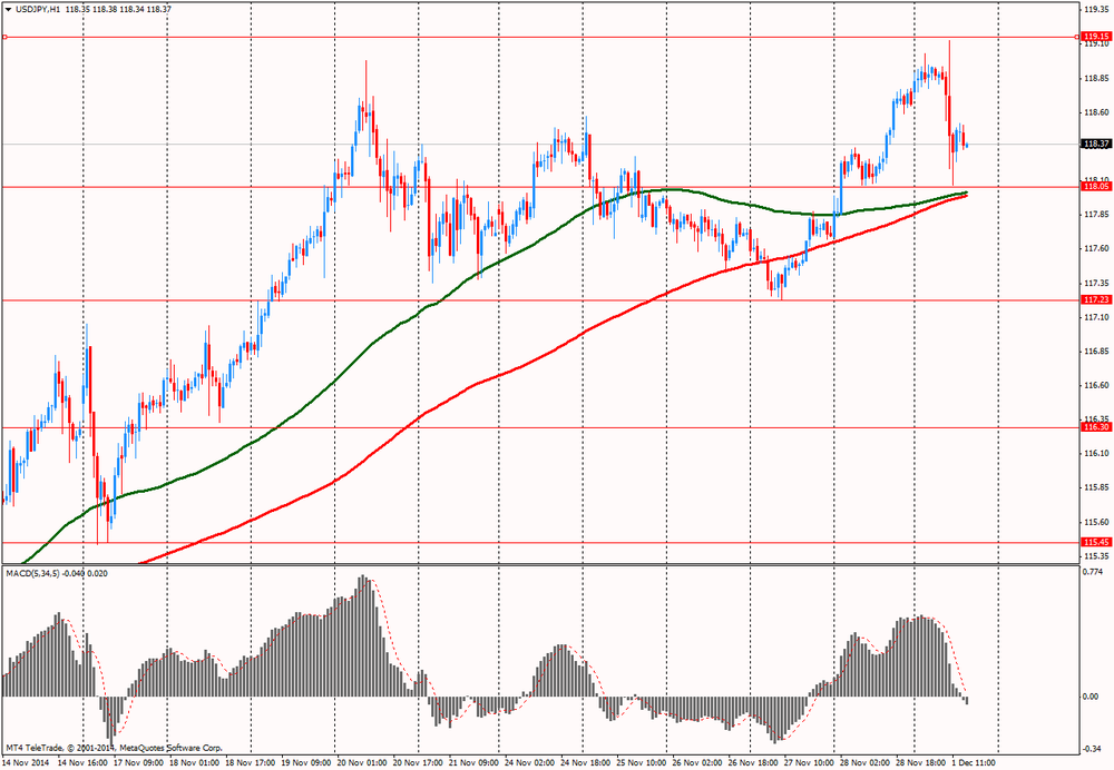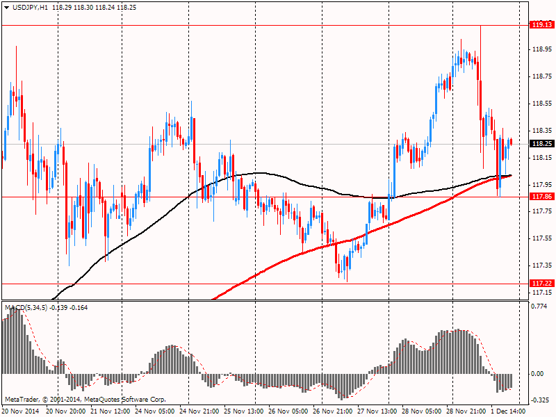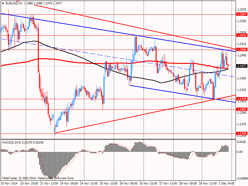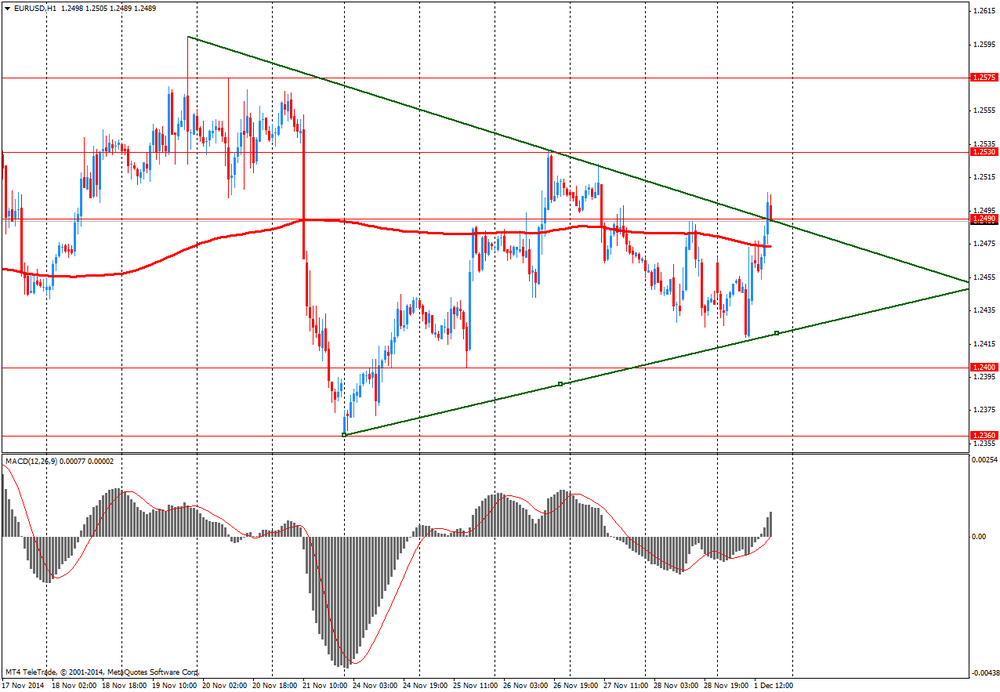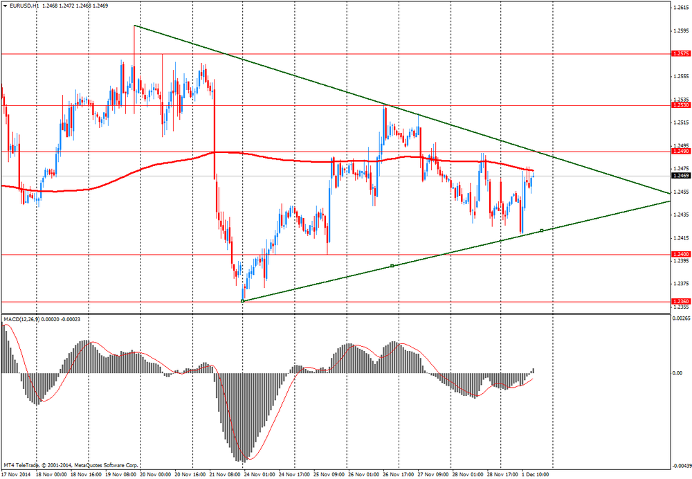 Пара EUR/USD заметно выросла, обновив при этом пятничный максимум, так слабость доллара перевесила пессимистичные показатели европейского PMI. Окончательные данные исследовательской организации Markit Economics показали: индекс PMI для промышленного сектора еврозоны в ноябре опустился до отметки 50,1 пункта, которая является минимальной с июня 2013 года, с 50,6 пункта в октябре. Согласно итоговым данным за ноябрь, в перерабатывающей промышленности Германии зафиксирован спад деловой активности: значение PMI составило 49,5 пункта, а не 50 пунктов, как сообщалось ранее. В октябре показатель был равен 51,4 пункта. Итальянский PMI промсектора остался в ноябре на уровне 49 пункта, хотя экономисты ожидали его увеличения до 49,4 пункта. Во Франции деловая активность сокращается 7-й месяц подряд, хотя оценка за ноябрь была пересмотрена с 47,6 до 48,4.